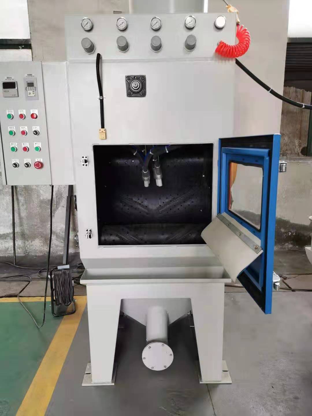 2、 操作時僅需工件定量置入環(huán)帶內(nèi),設(shè)定噴砂時間,即可啟動自動噴砂作業(yè),操作和維修均簡單易學(xué)。